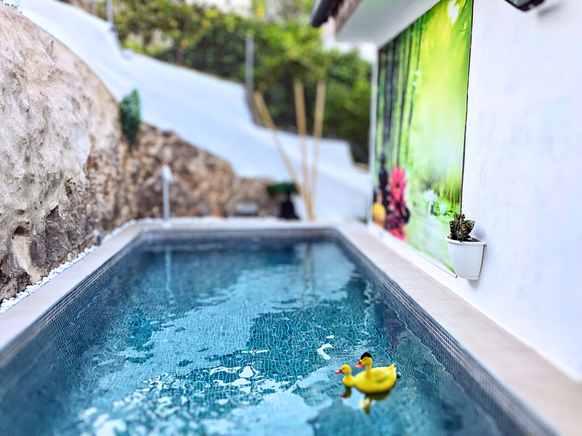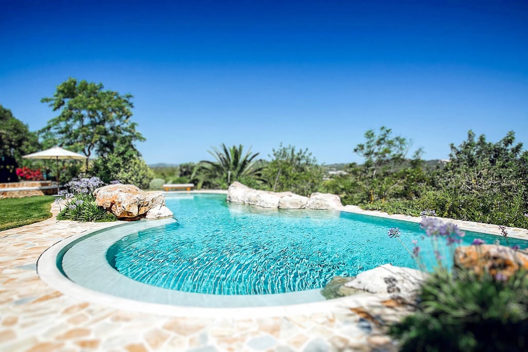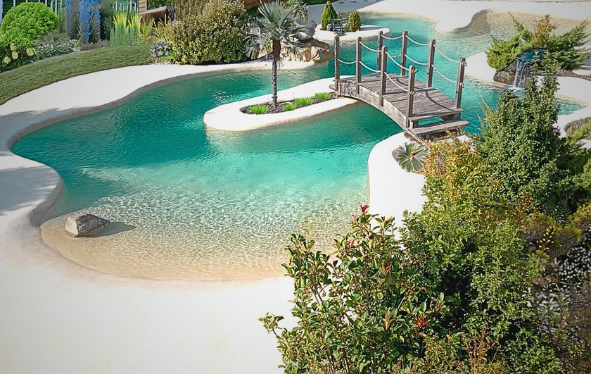Piscinas revestidas con arelite® revestimiento de arena de alto nivel, decorado de roca, madera y vegetación.