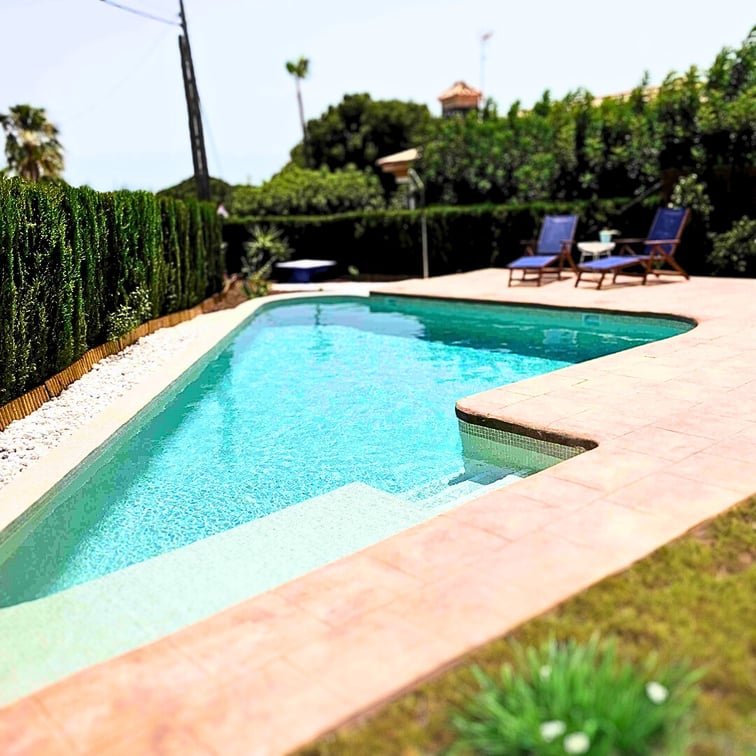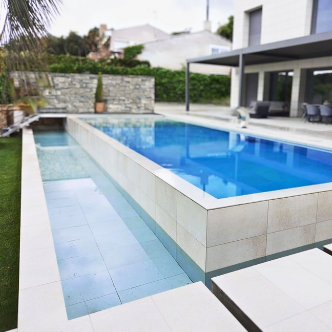Revestimientos del vaso de la piscina con gresites claros, y playas en piedra ibiza o impresos