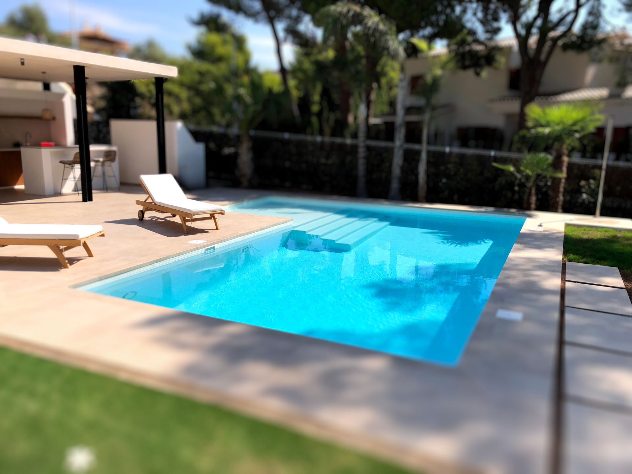 La piscina se revestirá de vítreo gresite, las playas en madera Ipe natural o madera tecnológica.