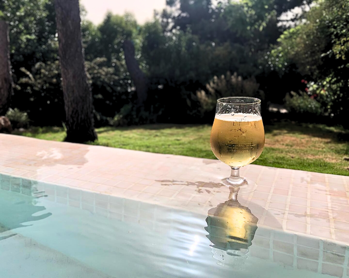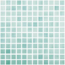 Piscina revestida íntegramente con vítreos de gresite de tonos claros, efecto desbordante.