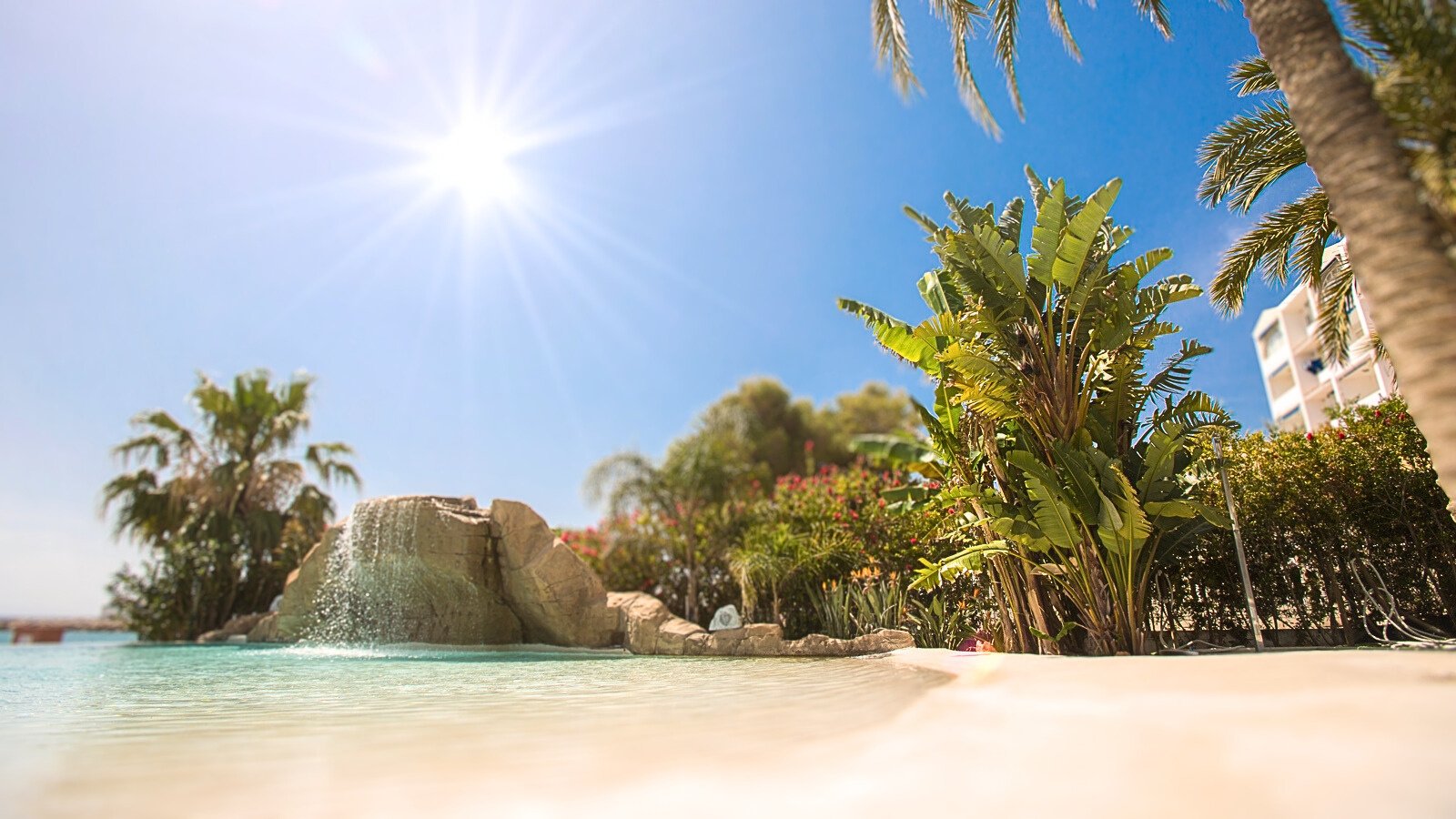 Piscinas revestidas con revestimientos continuos de cuarzo y marcite, decorado de piedra, roca esculpida y vegetación.